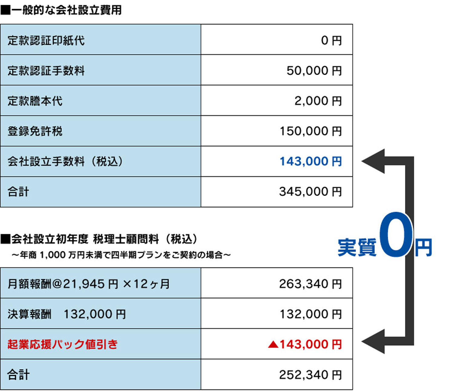 税理士との顧問契約とセットで、会社設立手続きの費用が実質的にゼロになる「起業家応援パック」を提供しています。これにより、コストを気にせず会社設立を進めることが可能です。